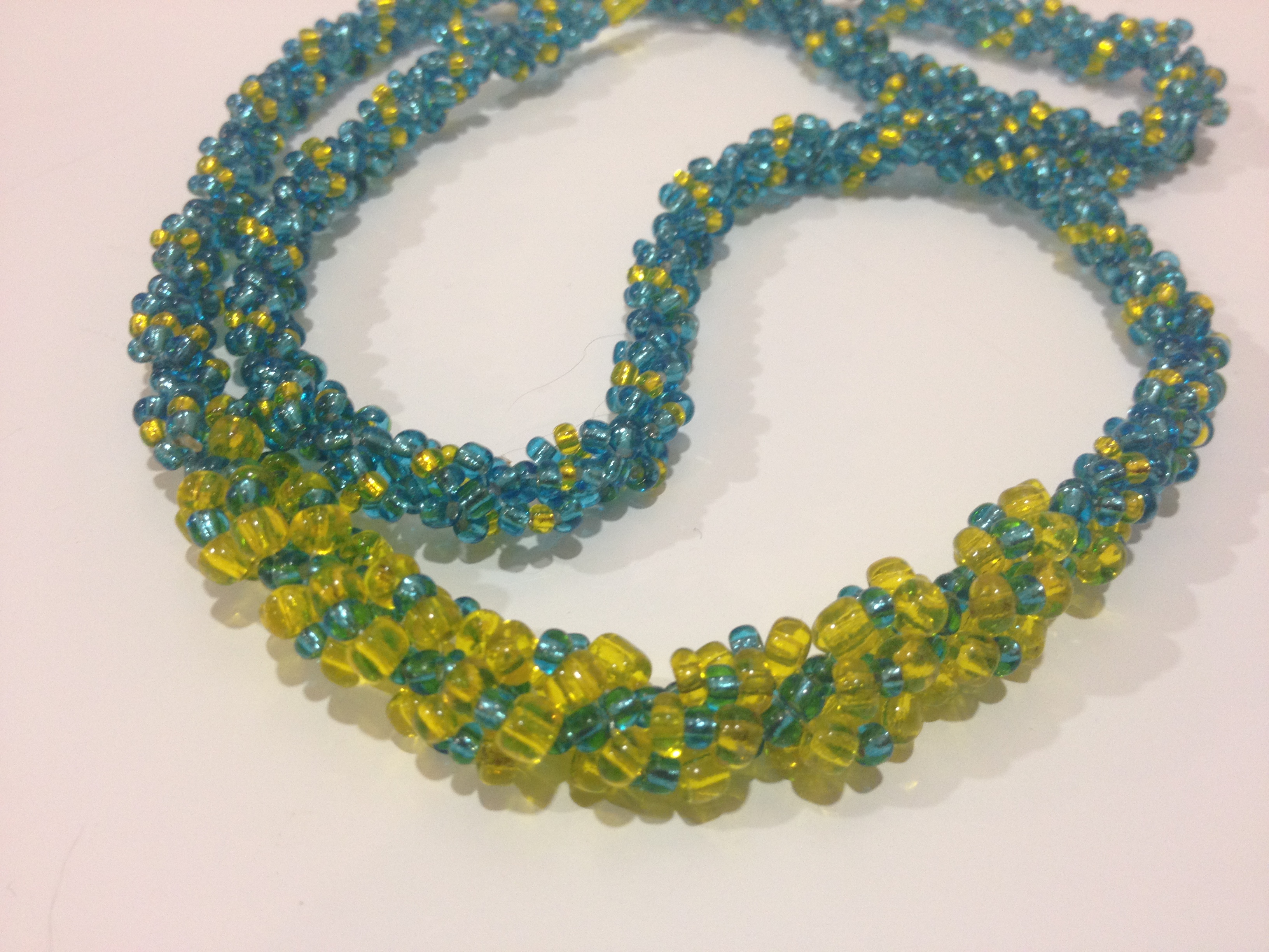 This one of a kind necklace is made with yellow and blue beads woven into a spiral chain, 25 inches, with a lobster clasp.