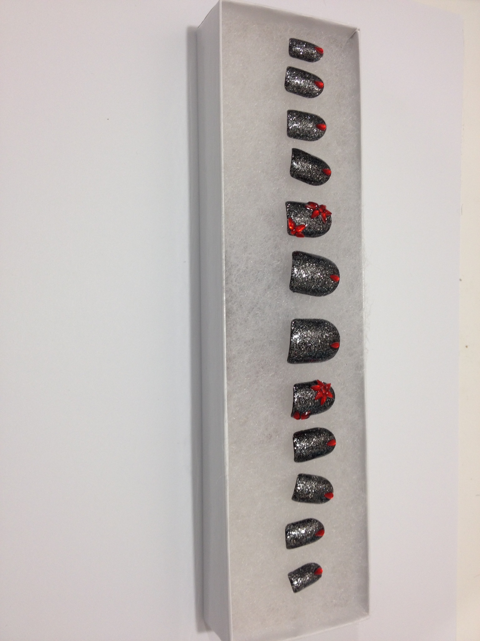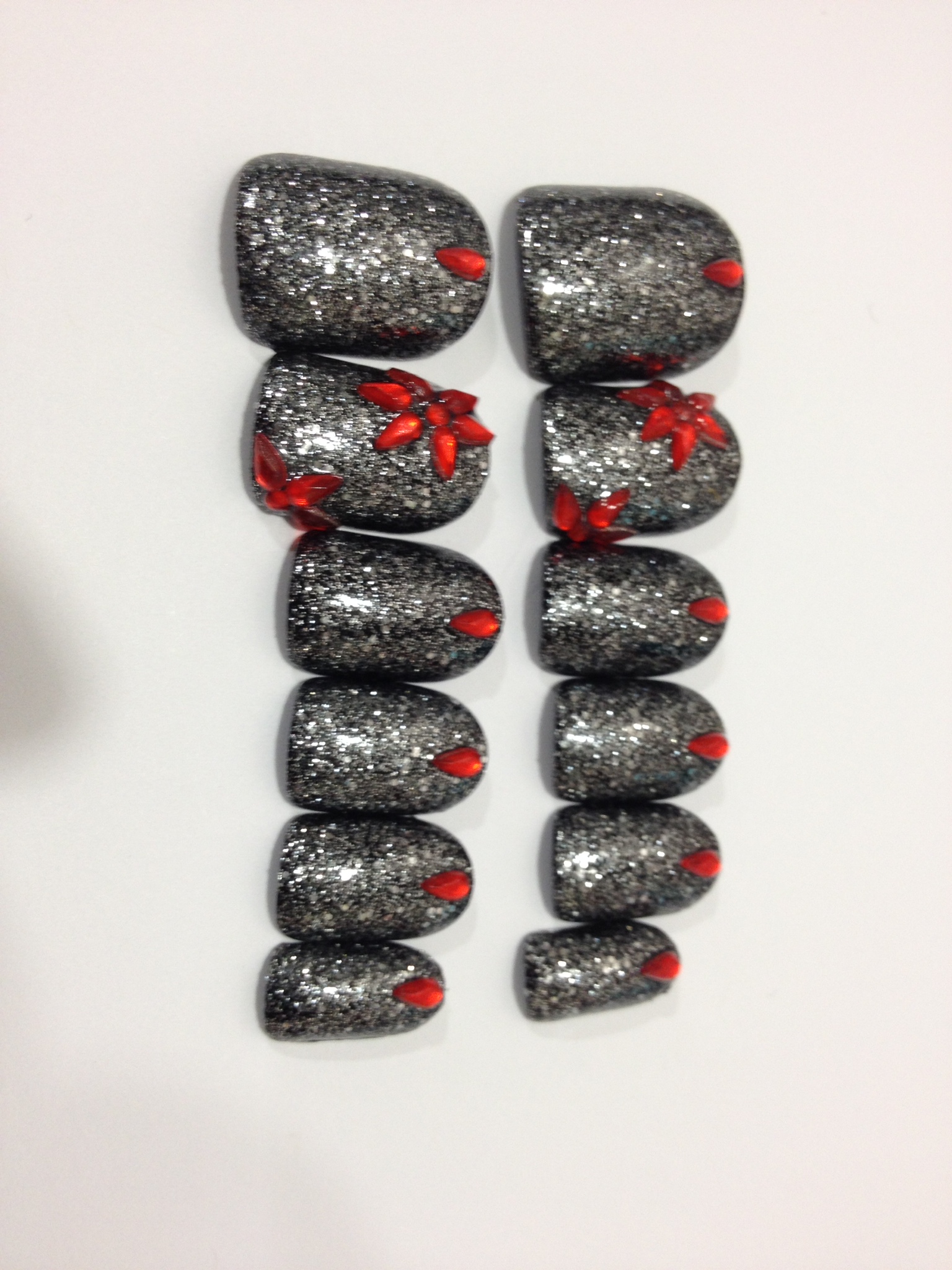 Black base with silver glitter polish and red tear drop crystal flowers .